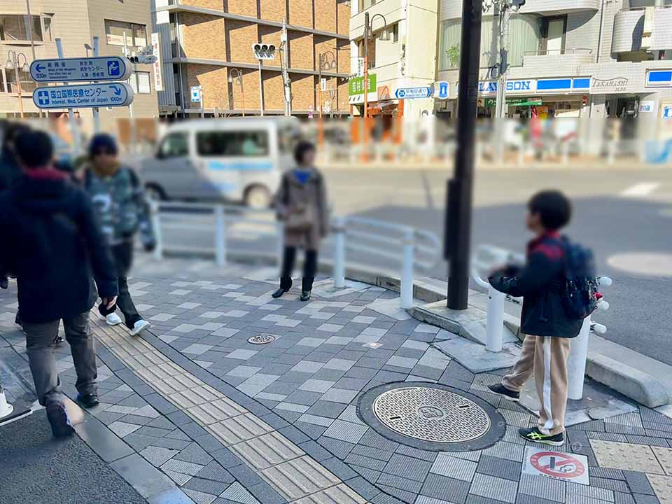 交差点を行き交う人と並ぶ私たちが混ざらないように係員の方が誘導してくれます