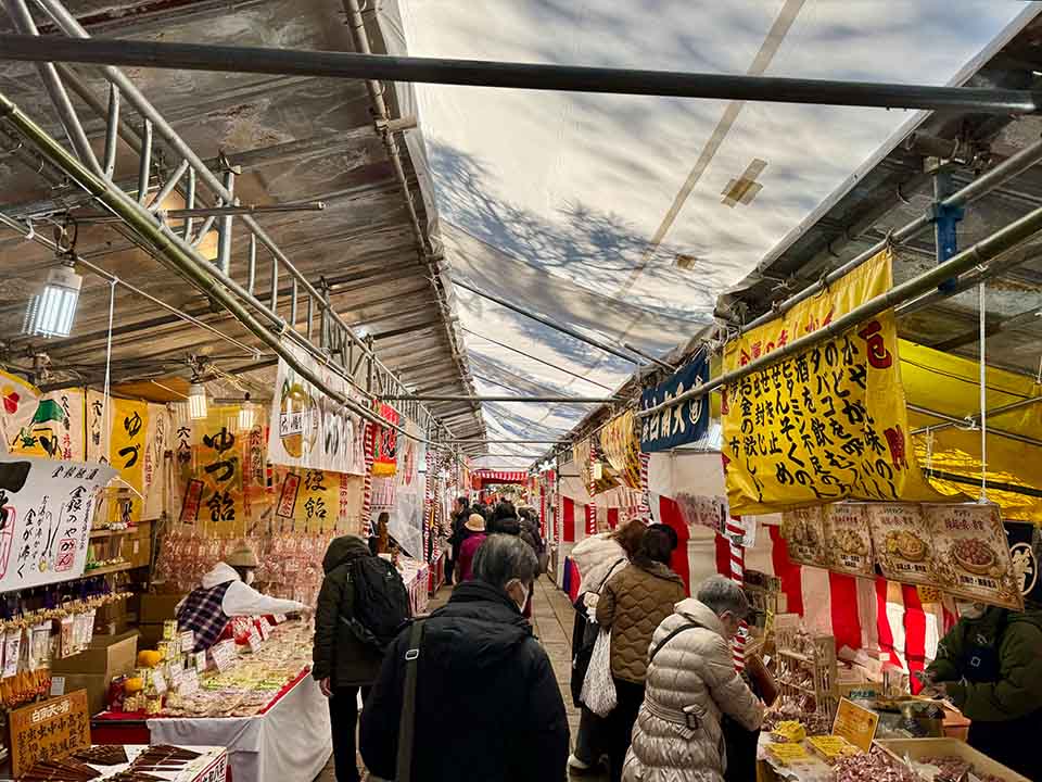 参道にはだるまさんなどの縁起物や干し芋、カップ酒、じゃこ…?いわゆるお祭りの屋台ラインナップではありません